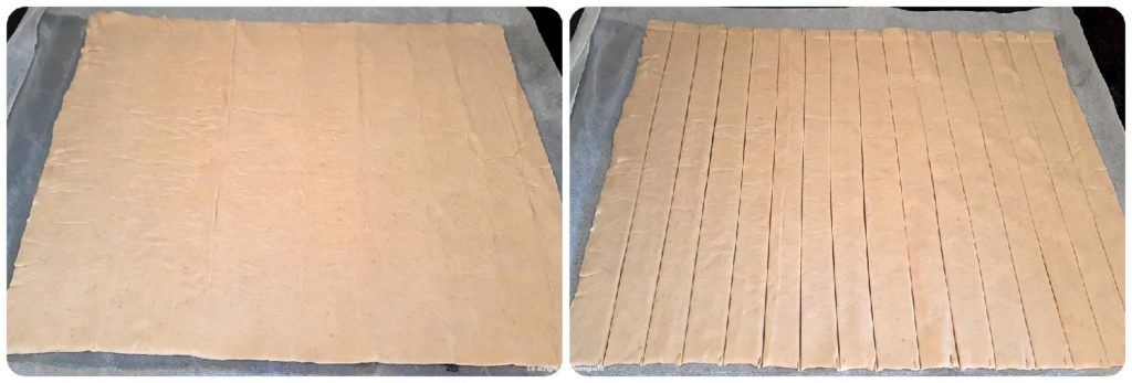 Pegue a massa folhada, desenrole e corte em tiras de 2 cm de largura pelo lado mais curto