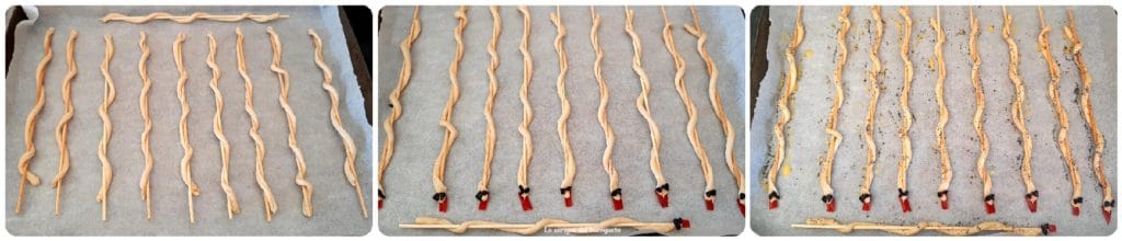 Enrole os cordões de massa em torno dos espetos de madeira.