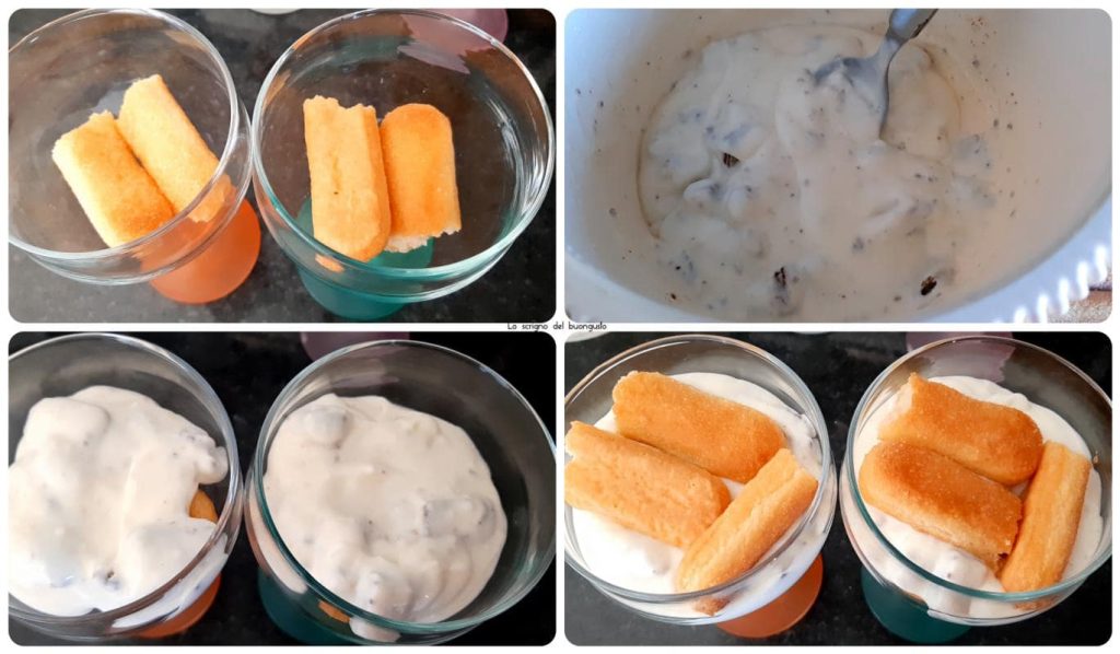 A base da taça é preenchida com biscoitos champanhe e uma porção de creme de mascarpone, acima do creme, mais camadas de biscoitos champanhe, levemente embebidos em rum.