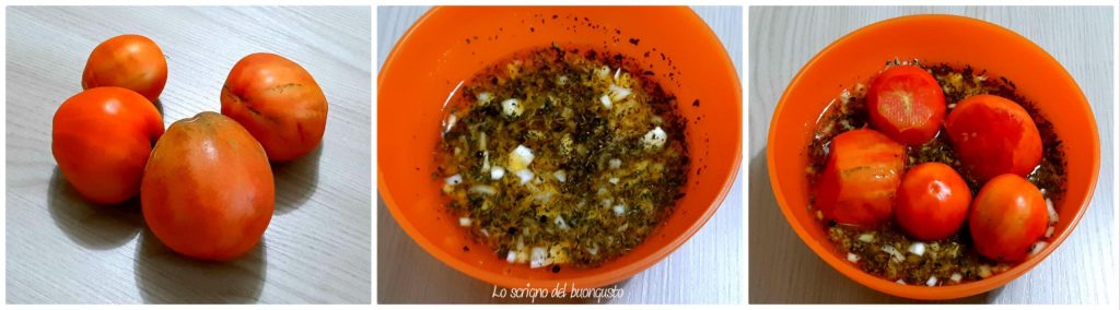 Mergulhe os tomates na marinada pela parte cortada e coloque-os na geladeira por 4-5 horas.