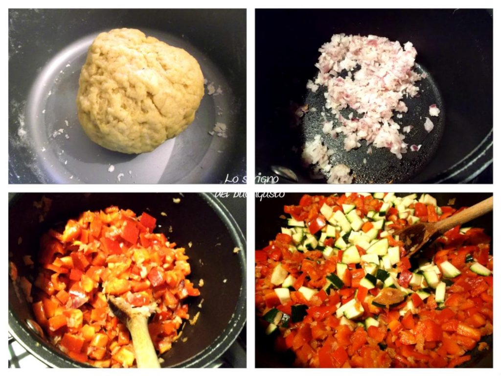 Pegue uma frigideira antiaderente, coloque o azeite e.v.o. e adicione primeiro a mistura de alho e cebola, deixando cozinhar por 2 minutos, depois adicione os pimentões, deixe cozinhar por mais dois minutos, mexendo bem.