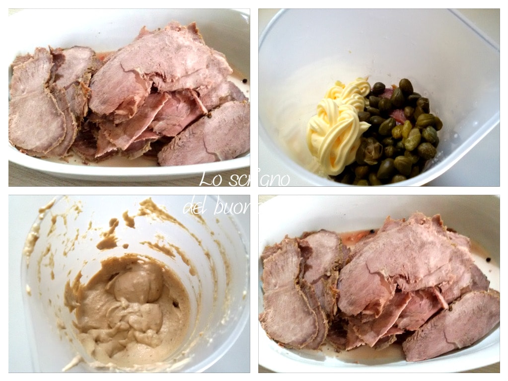 Pique muito finamente o atum, os filés de anchova, as alcaparras (previamente lavadas), transferindo tudo para uma tigela e adicionando a maionese misturando bem os ingredientes.