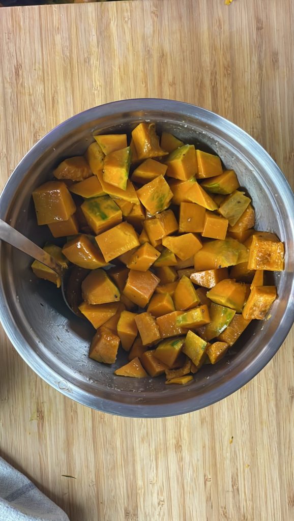 Misture novamente e continue até que toda a abóbora esteja bem temperada.