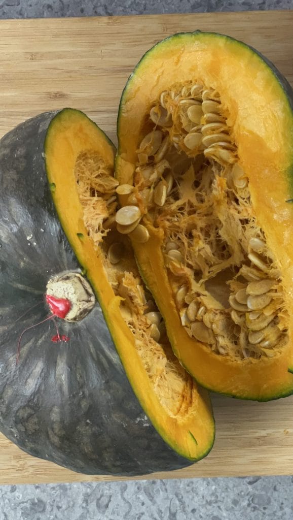 Comece a preparar a abóbora temperada na fritadeira elétrica cortando ao meio uma abóbora delica.
