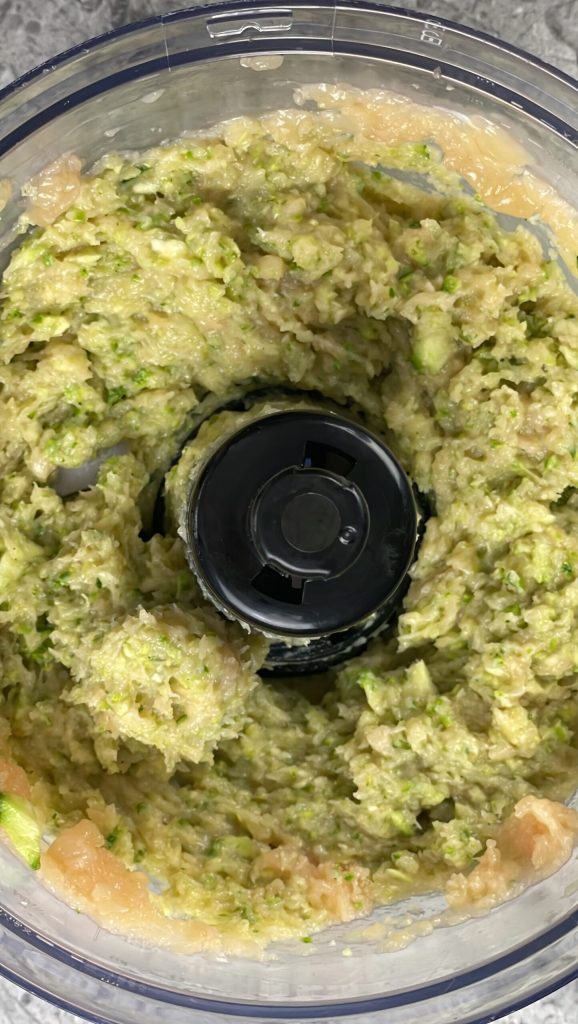 Transfira para o liquidificador e triture bem a carne até obter a mistura da foto.Lave as abobrinhas romanesas, retire as extremidades e corte em pedaços.