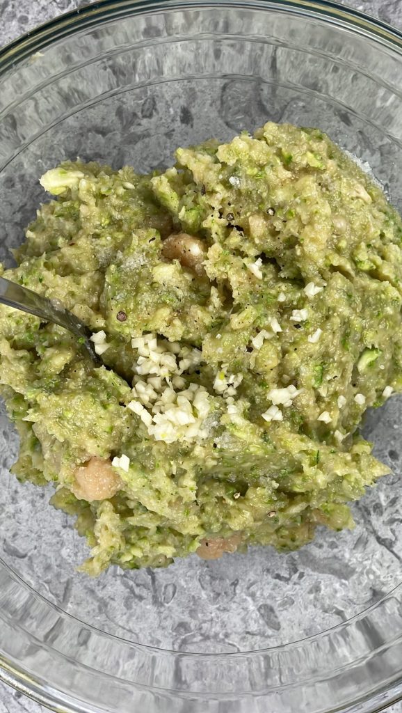 Adicione ao frango e triture novamente.Transfira a mistura para uma tigela e tempere com sal, pimenta-do-reino e um dente de alho picado, ou, se preferir, use alho em pó ou omita completamente.
