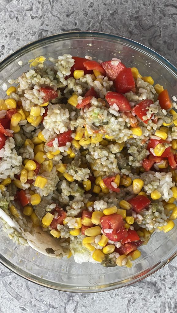Adicione ao arroz e misture novamente.Escorra bem o milho e coloque na tigela com o restante dos ingredientes.