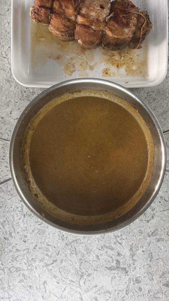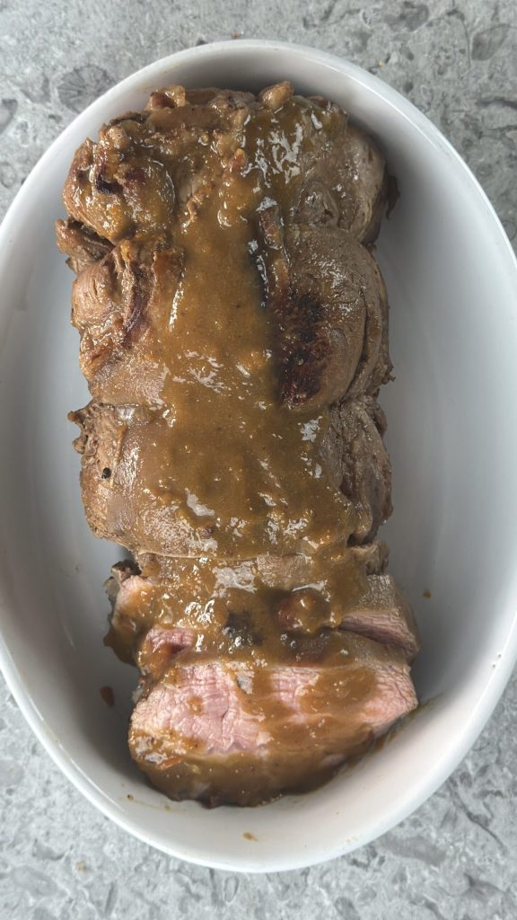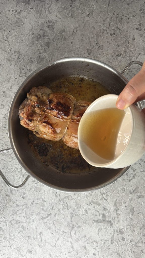 • Adicione o caldo de carne e deixe cozinhar em fogo baixo, com a panela semi tampada, até que o assado atinja a temperatura interna de 65°C (se preferir mais ao ponto, 60°C já está pronto).