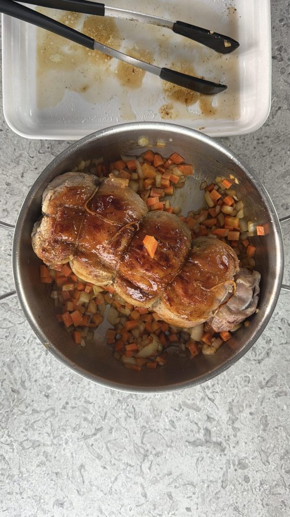 O cozimento segue lentamente na panela com caldo de carne, cenouras e cebola, que vão liberando todo o seu sabor. Um toque de brandy adiciona uma nota aromática delicada e contribui para deixar o fundo do cozimento ainda mais perfumado.