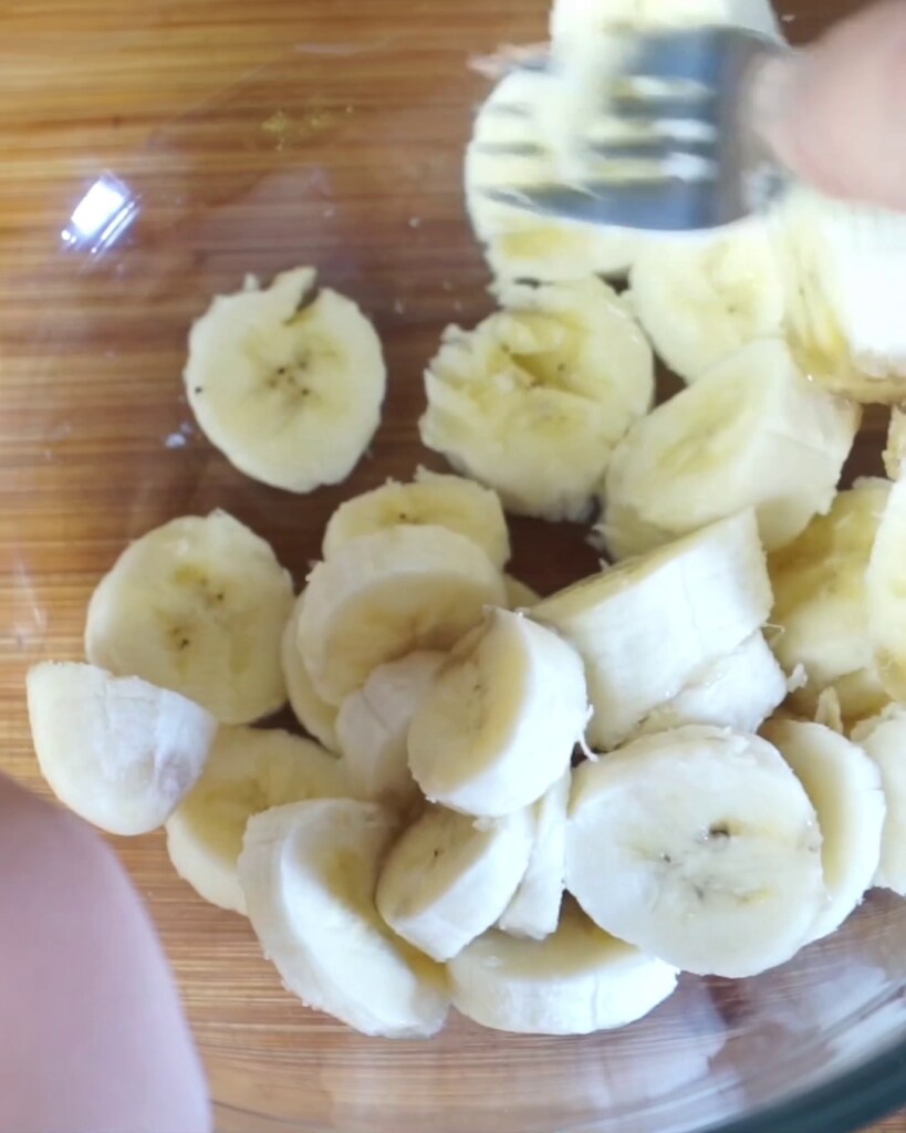 Comece a preparação do banana bread sem manteiga descascando e fatiando as bananas.