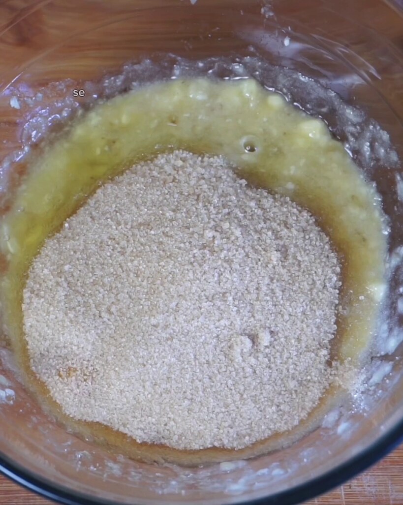 Adicione ao purê de bananas também o ovo, a canela e o açúcar mascavo.