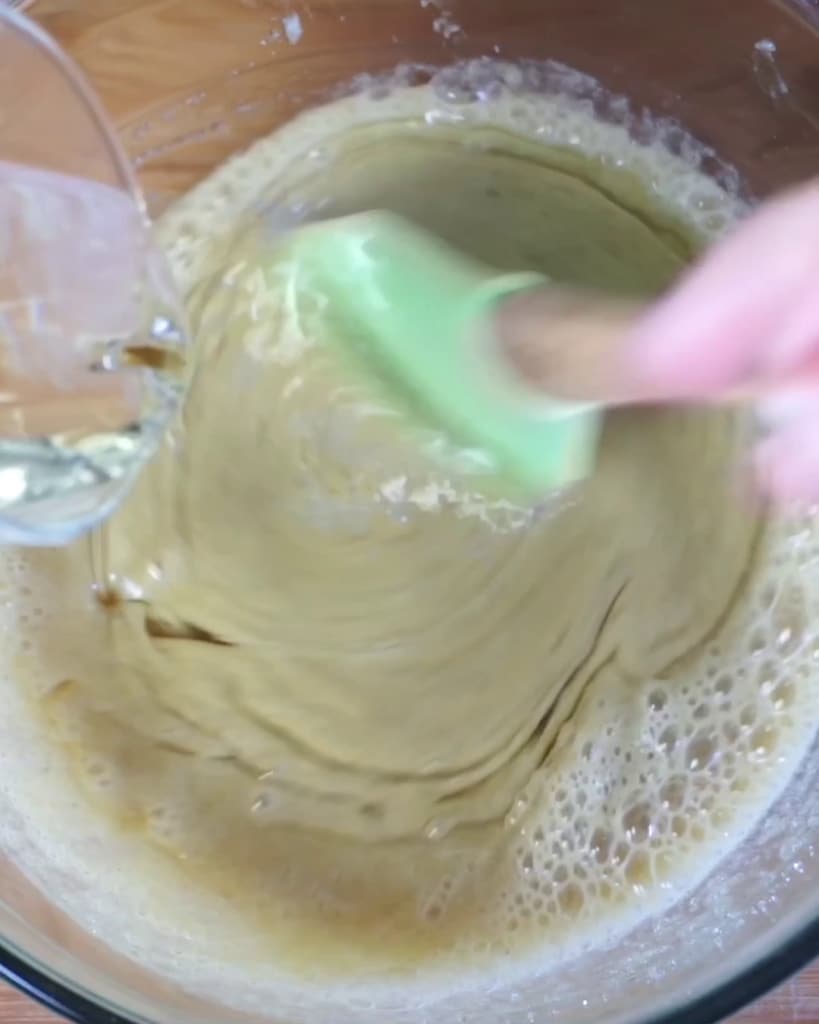 Continuando a misturar, adicione também o óleo de girassol em fio.
