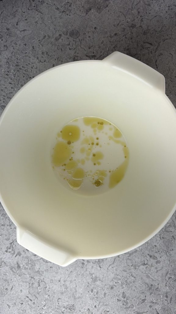 Depois de dissolver o fermento, adicione o açúcar e o óleo vegetal.