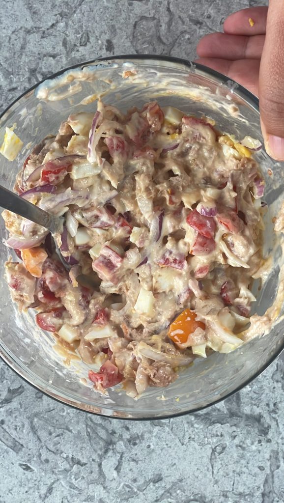 Continue com o atum e os ovos.Tempere a salada de atum e ovos com maionese e pasta de anchovas, sendo esta última opcional.