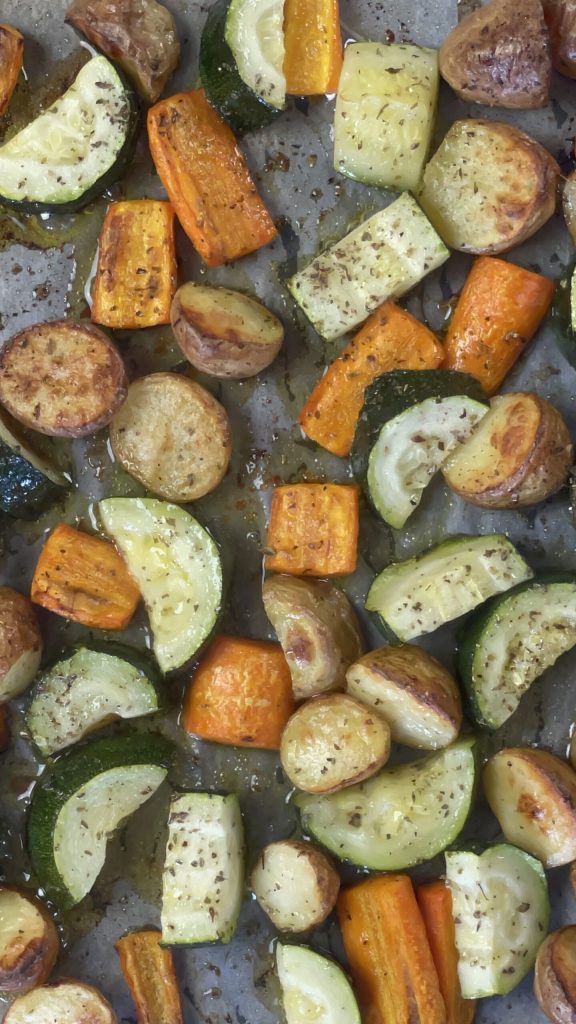 Batatas, cenouras e abobrinhas assadas