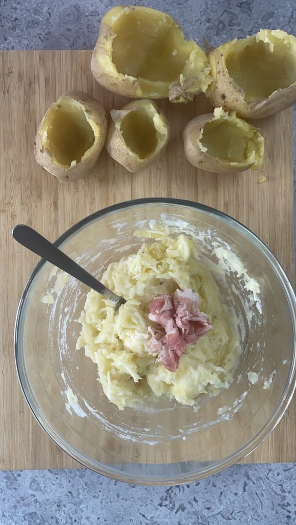 Misture bem até que todos os ingredientes estejam bem incorporados.Recheie as cascas das batatas com o recheio recém-preparado e coloque-as em uma assadeira.
