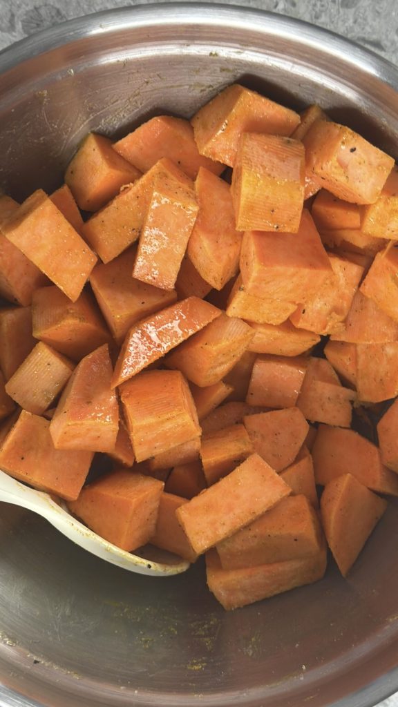 Adicione também o azeite e misture até que todos os pedaços de batata-doce estejam perfeitamente temperados.