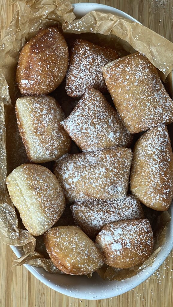Beignets de Nova Orleans, pequenos travesseiros de massa levedada fritos e cobertos com uma generosa polvilhada de açúcar de confeiteiro, um ícone da culinária crioula.