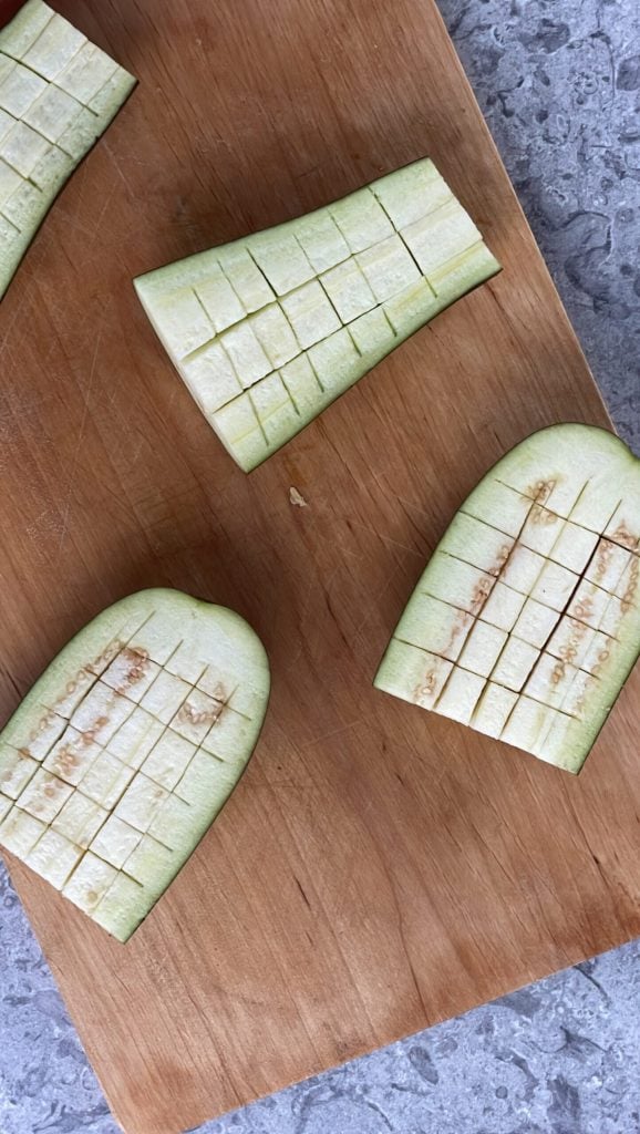Divida-as em quatro partes e depois faça cortes na polpa com uma faca pontiaguda formando uma grade.Transfira as berinjelas para o cesto da air fryer.