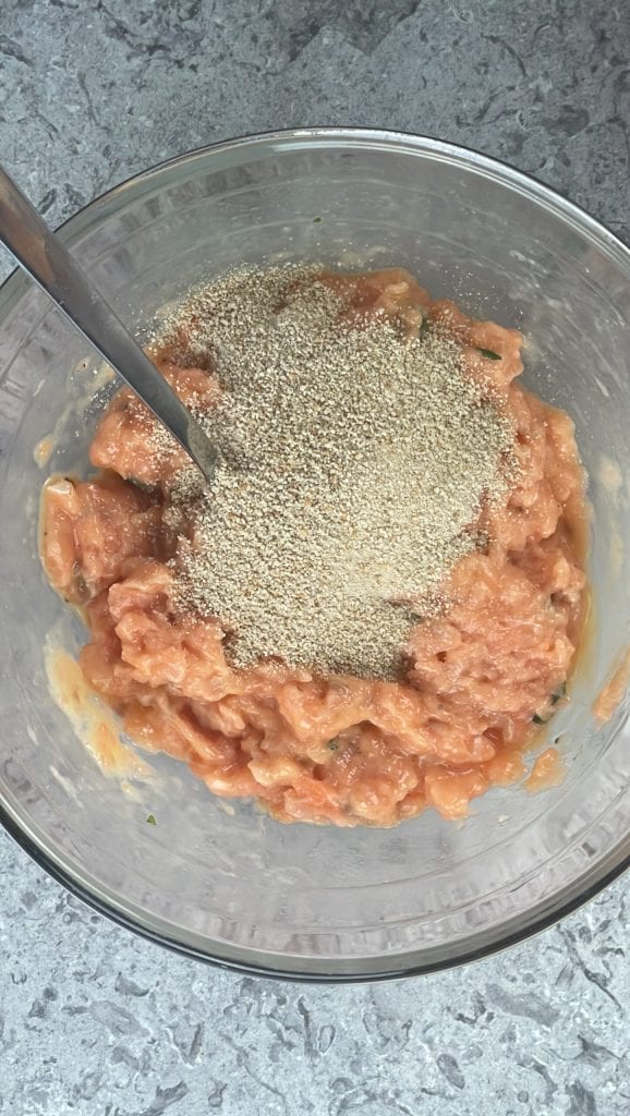 Comece a preparar os bolinhos de salmão na air fryer picando finamente o salmão em um processador de alimentos por um minuto ou com uma faca.