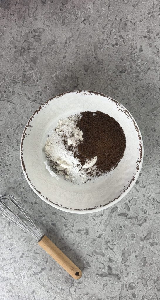 • Comece a preparação do bolo na caneca de café com gotas de chocolate colocando em uma tigela a farinha, o açúcar, o fermento em pó para bolos e o café solúvel (ATENÇÃO, não o do tipo moka),