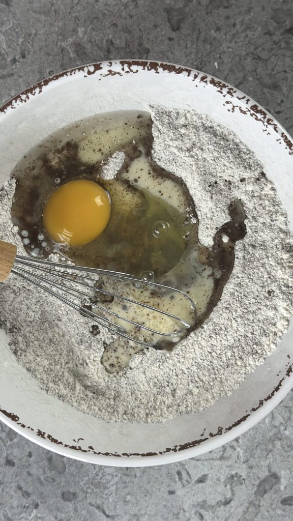 • Adicione também o leite — ou bebida vegetal se você for intolerante à lactose — o óleo e o ovo.