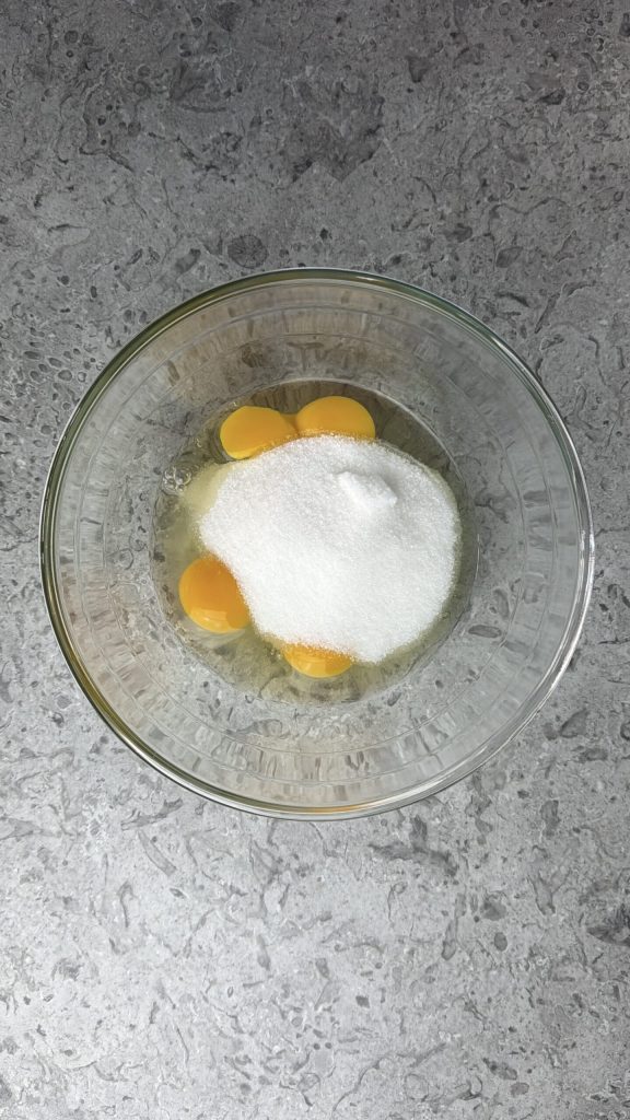 Quebre três ovos médios em uma tigela e adicione dois potinhos de açúcar.