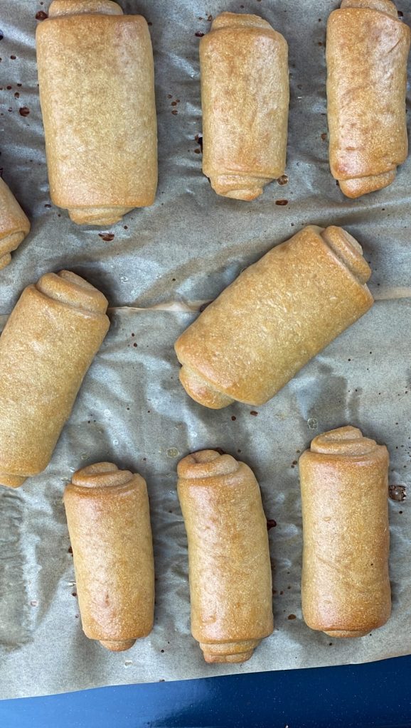 Divida em 8-10 partes com uma faca ou espátula.Dê às brioches o formato que preferir: redonda, croissant ou como eu fiz em pãezinhos enrolando a massa sobre si mesma e selando bem a junção.