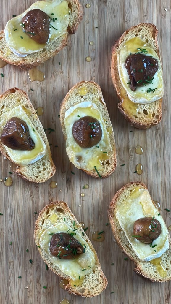 Bruschettas com brie e figos secos, uma entrada simples e elegante que combina o crocante do pão rústico torrado com a cremosidade do brie e a doçura dos figos secos.