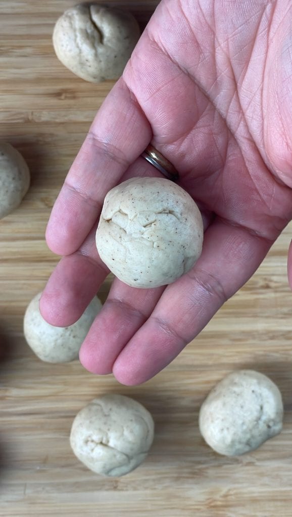 Com essas quantidades, você obterá cerca de 14.Faça uma bolinha de cada porção trabalhando a massa como um bolinho.