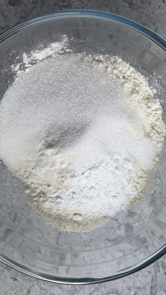• Inicie o preparo das castagnole de iogurte na fritadeira a ar pesando numa tigela a farinha 00, o açúcar e o fermento em pó para doces.