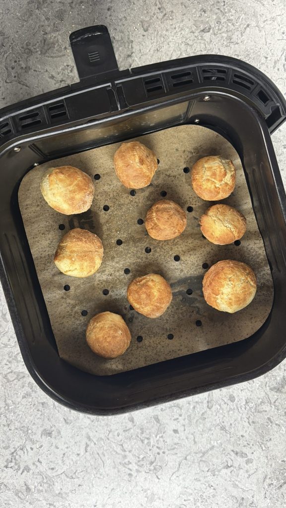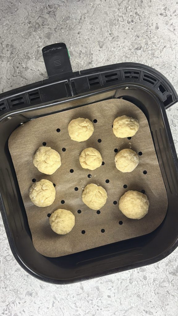 • Coloque as castagnole de Carnaval na cesta da fritadeira a ar pré-aquecida a 200°C bem espaçadas (elas vão crescer durante o cozimento).