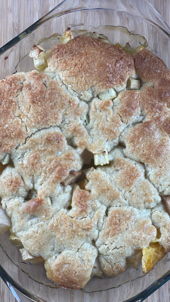 A cobertura do cobbler é preparada com uma massa simples à base de farinha 00, açúcar, fermento em pó, uma pitada de sal, manteiga e leite. O resultado é uma crosta macia e amanteigada, que se acomoda sobre a fruta criando um agradável contraste de texturas. Se desejar um toque mais rico, pode substituir o leite por creme de leite, obtendo uma cobertura ainda mais macia e cremosa.