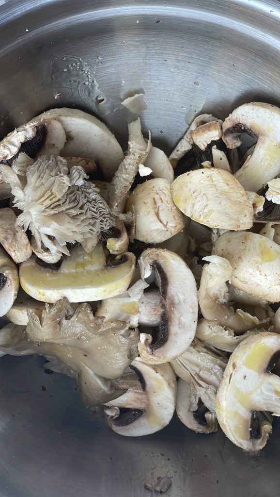 Misture novamente, todo o tempero deve aderir bem aos cogumelos.