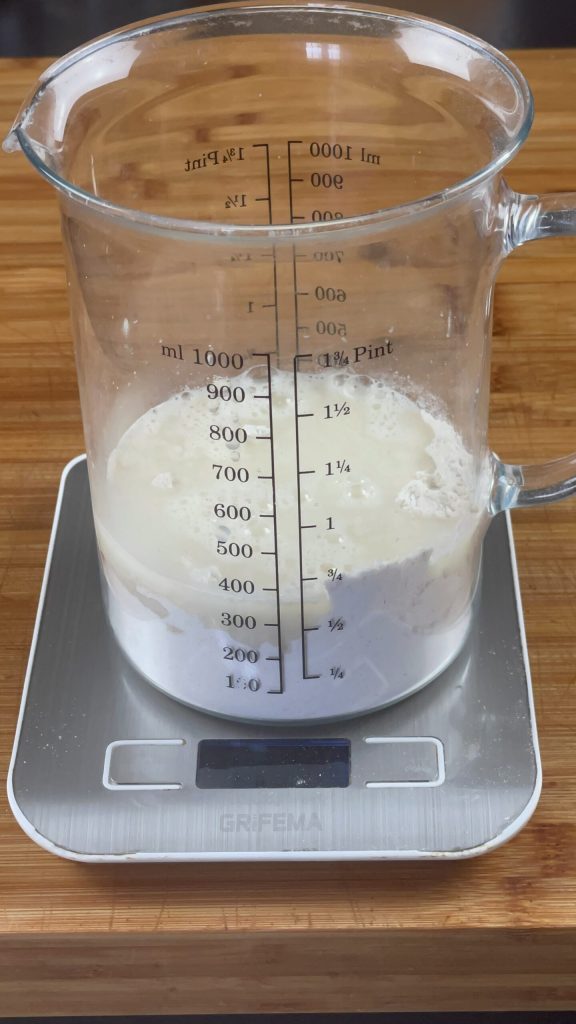 Coloque em uma tigela a farinha e o fermento, adicione a água e o leite em temperatura ambiente aos poucos, sempre mexendo.Uma vez obtida uma massa bem hidratada e homogênea, deixe-a crescer por pelo menos 2 horas (deve dobrar de volume).