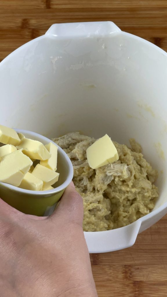 Continue com a manteiga amolecida, sempre um pedacinho de cada vez.