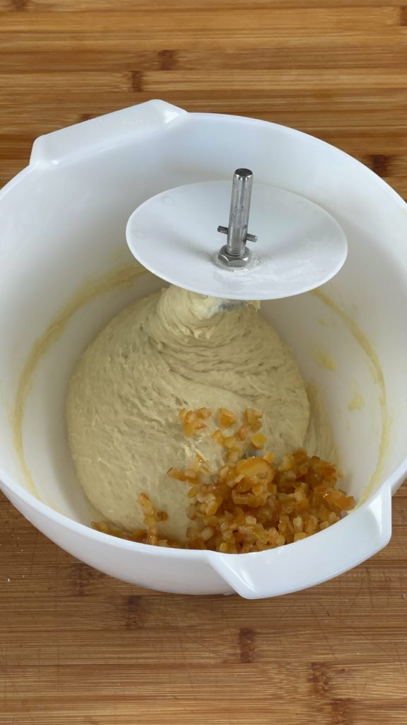 Finalize a massa com o aroma de laranja e a laranja cristalizada.