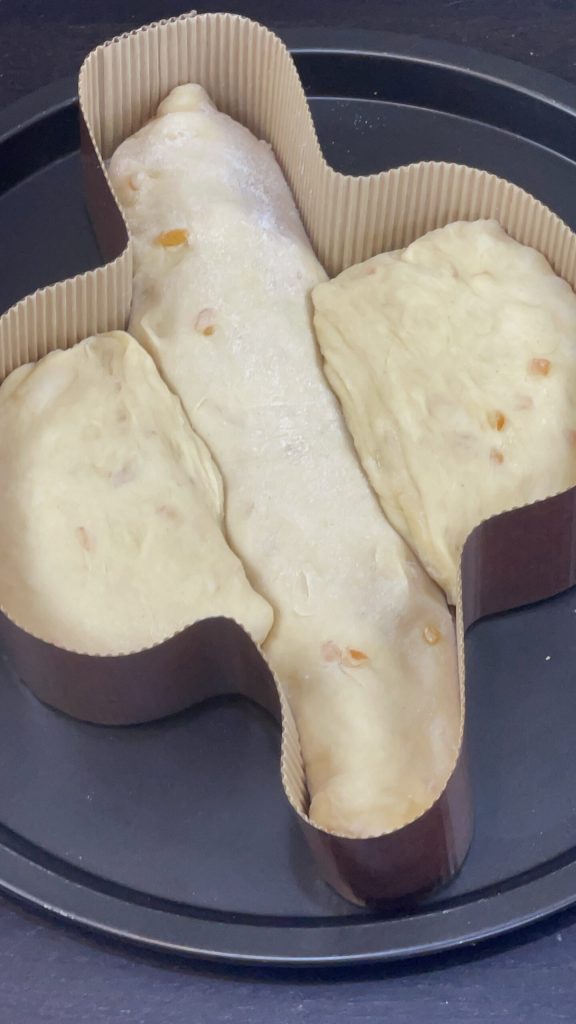 Transfira a massa levedada para uma superfície de trabalho e depois divida a massa em duas partes: uma para o corpo e outra para as asas. Divida novamente ao meio a parte das asas e transfira tudo para uma forma de colomba de 750g.