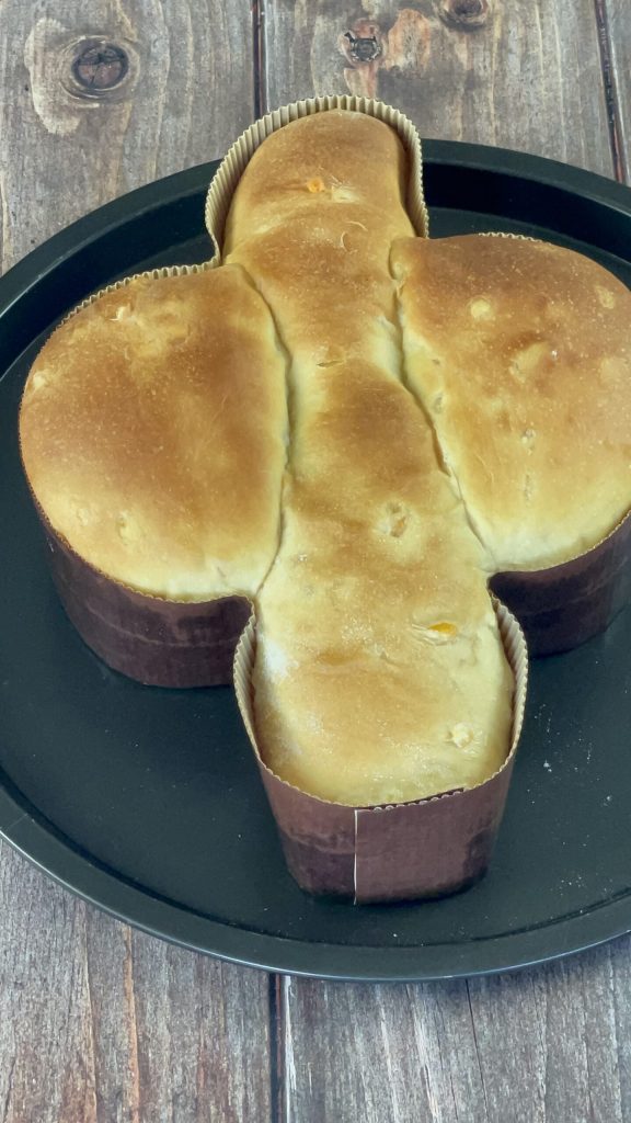 Deixe crescer novamente até que a massa atinja a borda da forma.Asse a colomba de chocolate e laranja em forno estático a 160°C por cerca de 50 minutos.