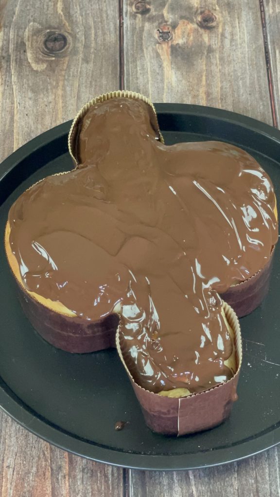 Deixe esfriar um pouco e passe para a cobertura.Derreta no microondas ou em banho-maria o chocolate amargo e espalhe com uma espátula sobre a colomba.