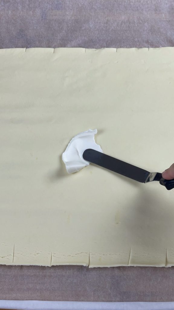 • Comece a preparação da colomba de massa folhada espalhando em cada rolo o queijo fresco cremoso.