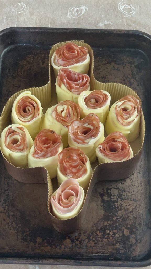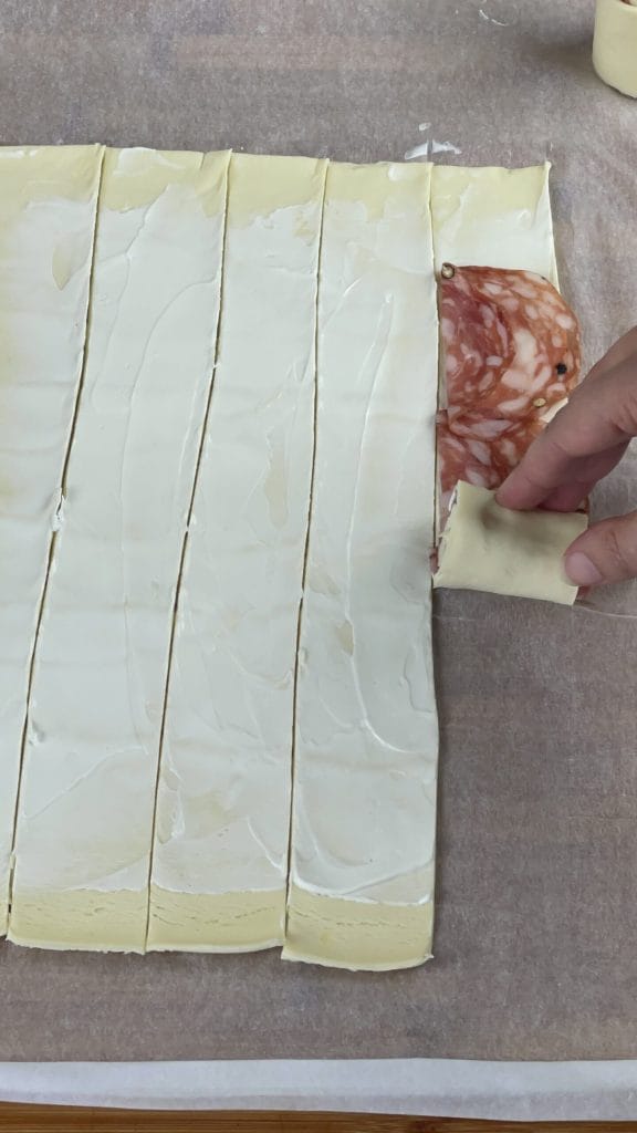 • Adicione também as fatias de salame (3 ou 4 por tira) dobrando-as levemente e certificando-se de deixar as fatias saindo um pouco de um lado para obter o efeito “rosa de massa folhada”.