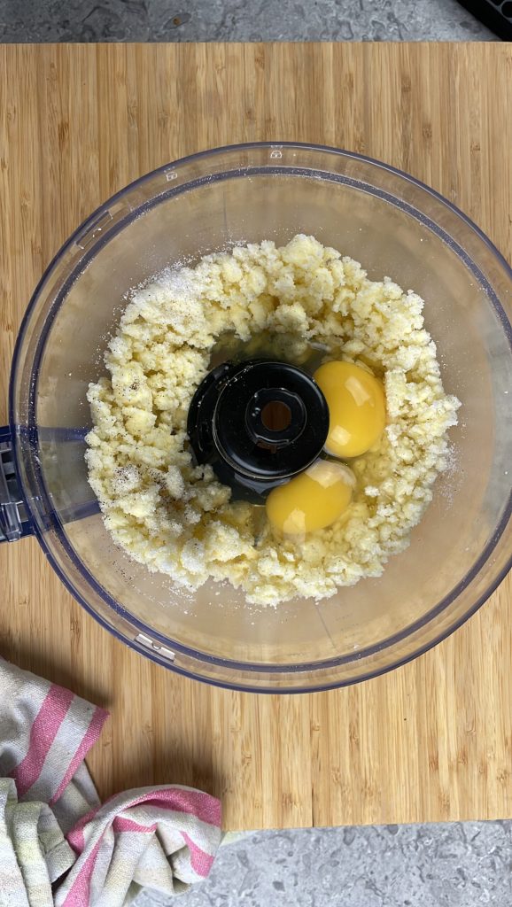 Coloque no copo de um processador ou robô de cozinha a manteiga – bem gelada – cortada em cubos, o açúcar e a baunilha.Processe até obter uma espécie de massa arenosa.