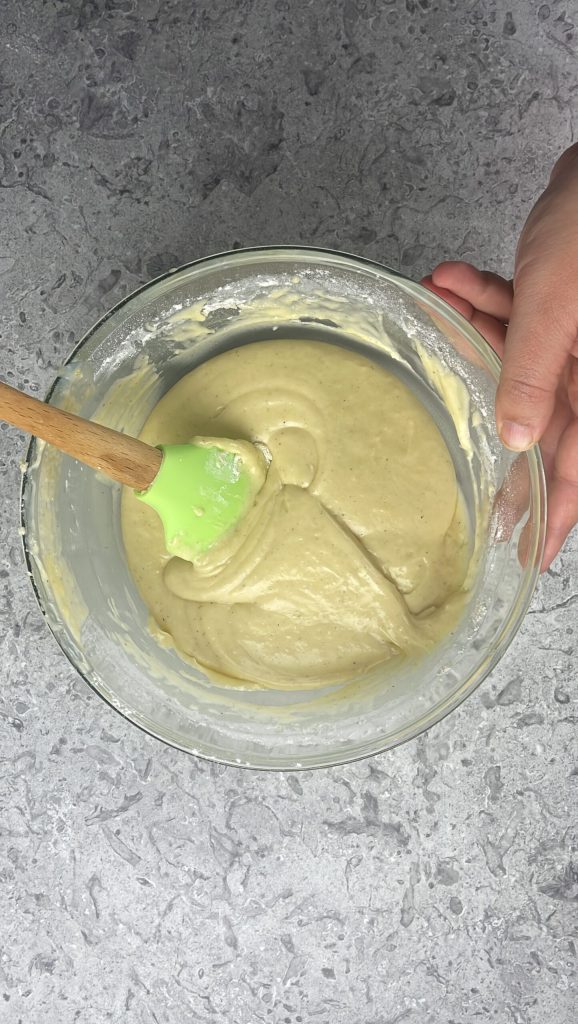 Peneire a farinha 00 e o fermento em pó para doces diretamente na tigela com os ingredientes líquidos.