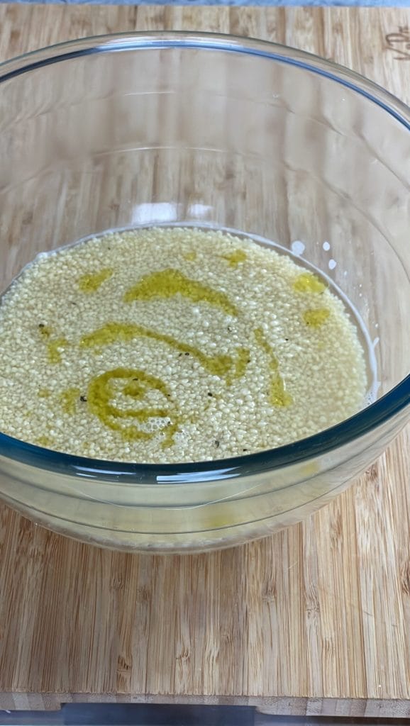 Cubra o cuscuz com a água quente (o nível da água deve ultrapassar cerca de um dedo o do cuscuz) e adicione um fio de azeite extra virgem.