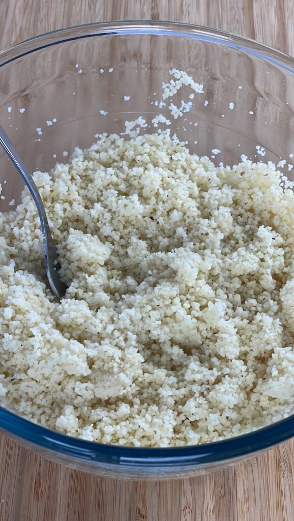 Cubra a tigela com um pano de prato e deixe descansar por 5 minutos.Uma vez que o cuscuz tiver absorvido toda a água, solte-o com a ajuda de um garfo.