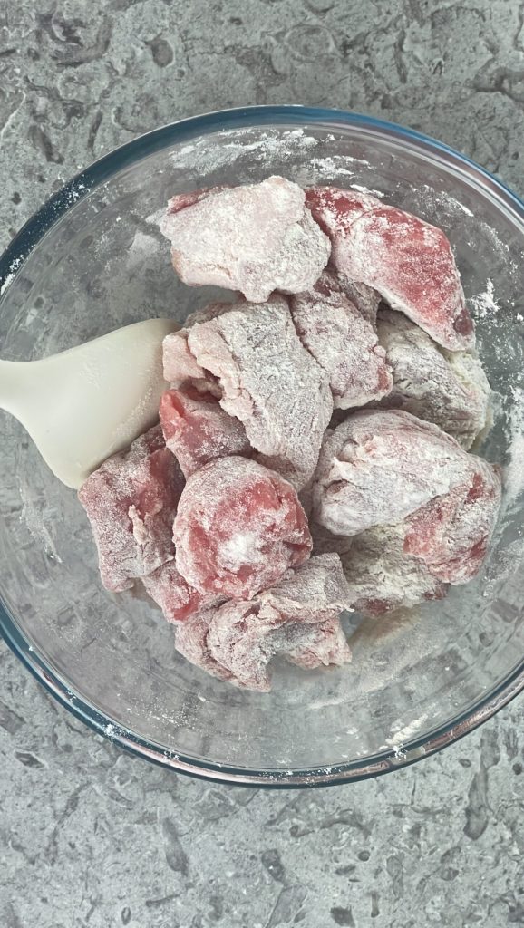 Coloque o ensopado em uma tigela, adicione uma colher de sopa de farinha e misture até que todos os pedaços de carne estejam bem enfarinhados.Coloque na panela de cozimento lento o azeite de oliva extra virgem.