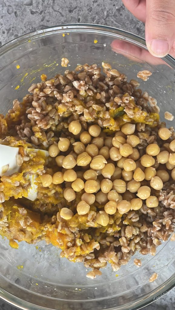 Tempere o farro com sal e azeite, adicione a abóbora cozida no vapor e o grão-de-bico escorrido.
