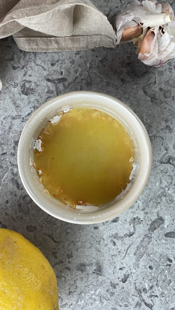 Retire o dente de alho e despeje o molho de limão e açafrão na frigideira.