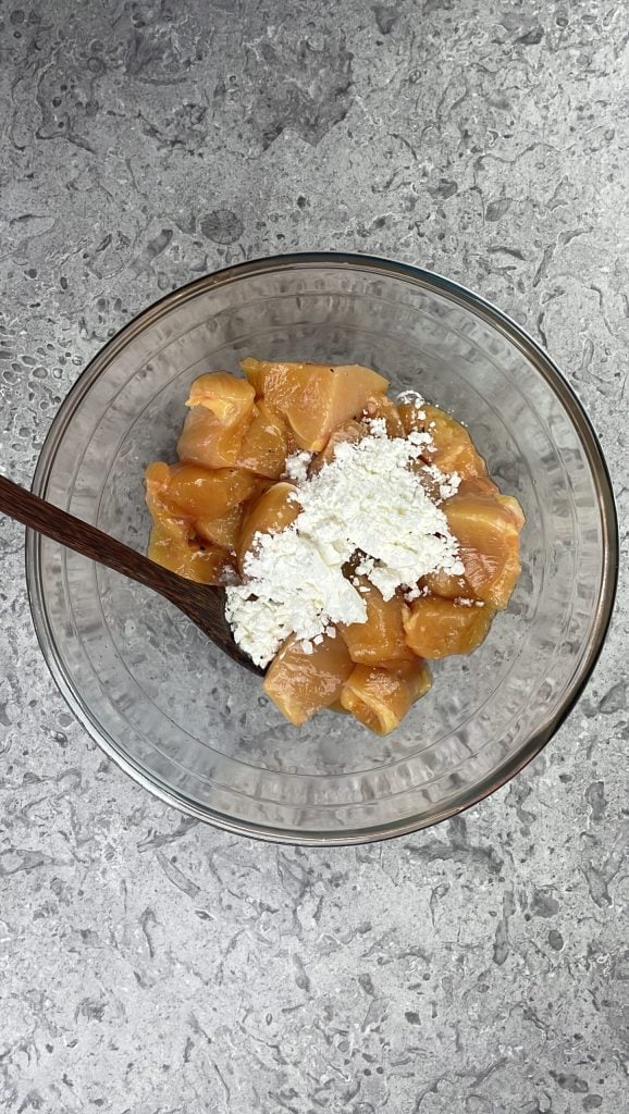 Adicione também o amido de milho e misture bem.Continue a preparação com dois dentes de alho, 2-3 ramos de tomilho, o suco de meio limão e uma colher de azeite de oliva extra virgem.